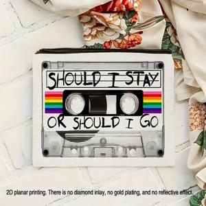 "Should I Stay or Should I Go" 프린트가 있는 양면 레트로 카세트 테이프 메이크업 가방 - 빈티지 지퍼가 달린 화장품 파우치
