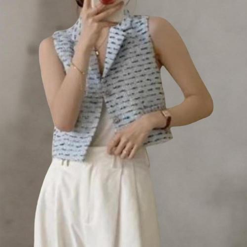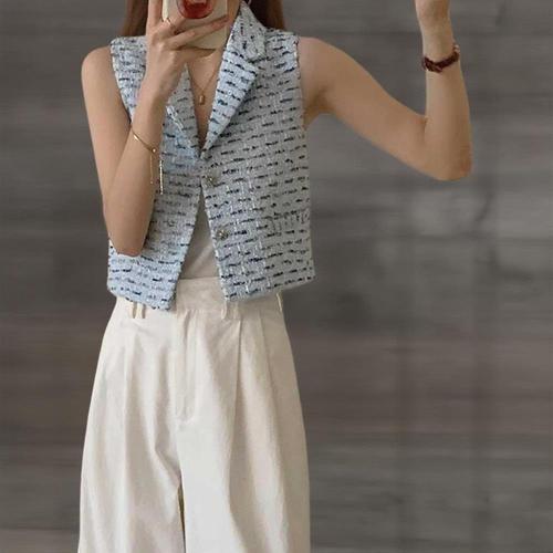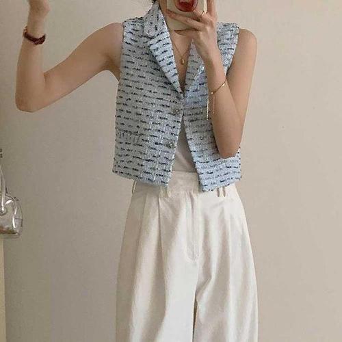 [신상오픈런]여성 트위드 버튼 카라넥 세미크롭 민소매 재킷