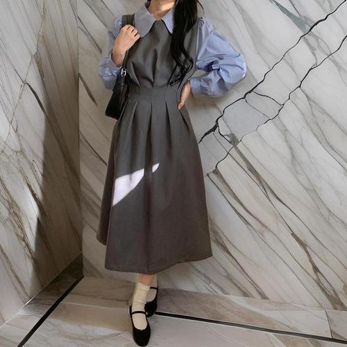 [다잇템_패션]여자 카라셔츠 핀턱 투컬러 코디 롱원피스