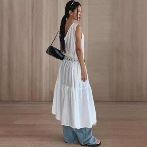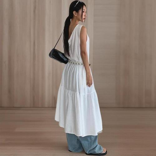 [신상오픈런]여성 단추 장식 핀턱 민소매 롱 원피스 무지컬러