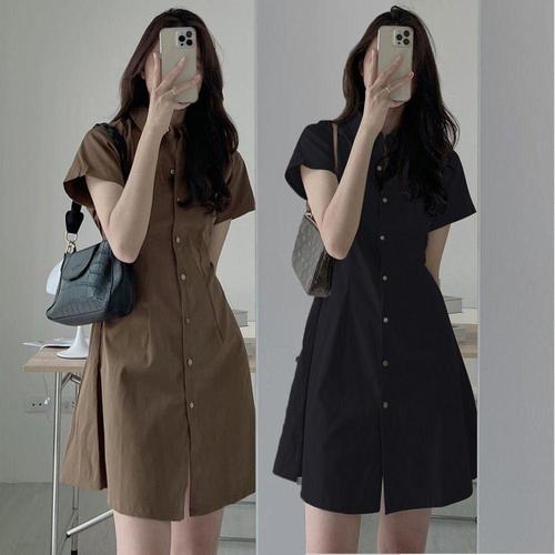 [모노무드]모노무드 여성 A라인 반팔 셔츠 원피스 단정한 스타일 핀턱 카라 2컬러
