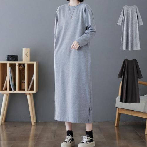 [옷자락]여자 캐주얼 무지 찰랑핏 라운드넥 긴팔 롱 원피스