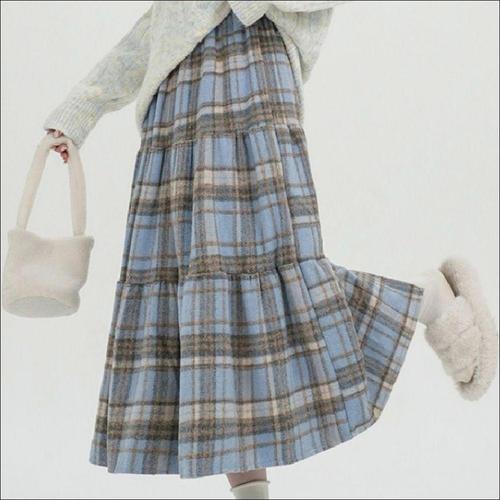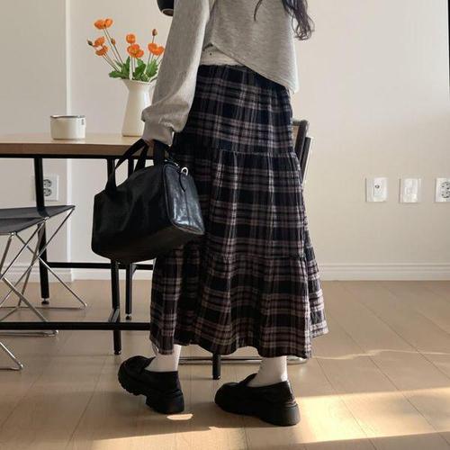 [다잇템]여자 면원단 격자 캉캉 시즌리스 롱스커트