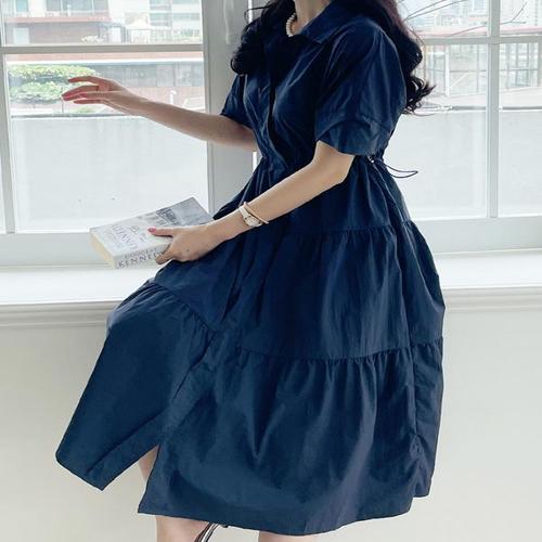 [샵앤]여성 카라 단추 4단 캉캉 셔링 롱원피스 ARA-WDR-4949-네이비