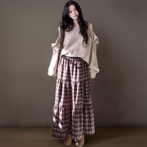 [미라클세븐]여성 체크 패턴 A라인 롱 플레어 원피스 캉캉 디자인