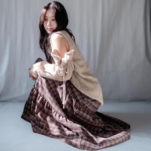 [신상오픈런]여성 휴양지 원피스 체크 뷔스티에 캉캉 스타일 롱 드레스