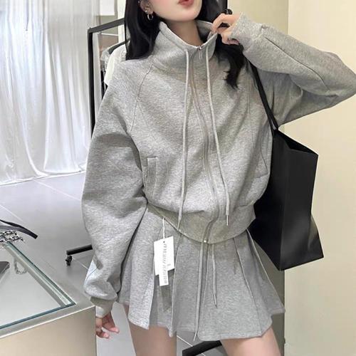 [옷자락]여자 캐주얼 후드 스트링 루즈핏 집업 치마바지 세트