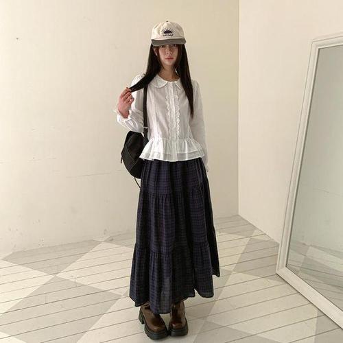 [옷자락] 여자 캐주얼 데이트룩 체크 플레어 맥시 스커트