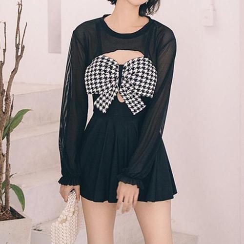 [옷자락]여자 체형커버 사선 드레스 후레아 롱슬리브 콘트라스트 수영복