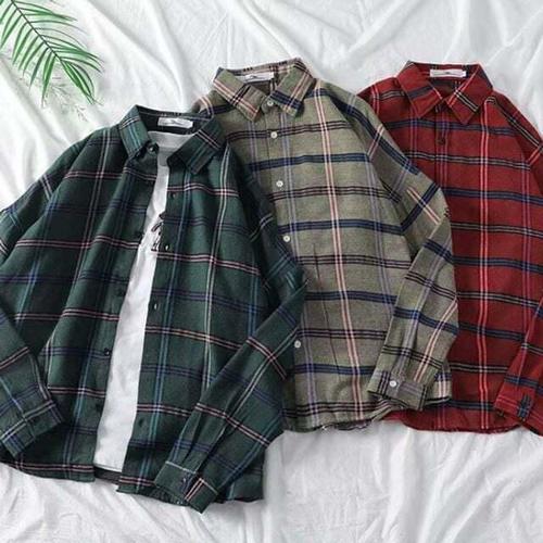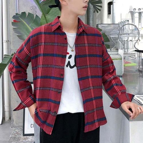 레트로 일본식 남성 체크 무늬 셔츠 순수 코튼 루즈 긴 소매 캐주얼 클래식 청소년 패션 커플 의류