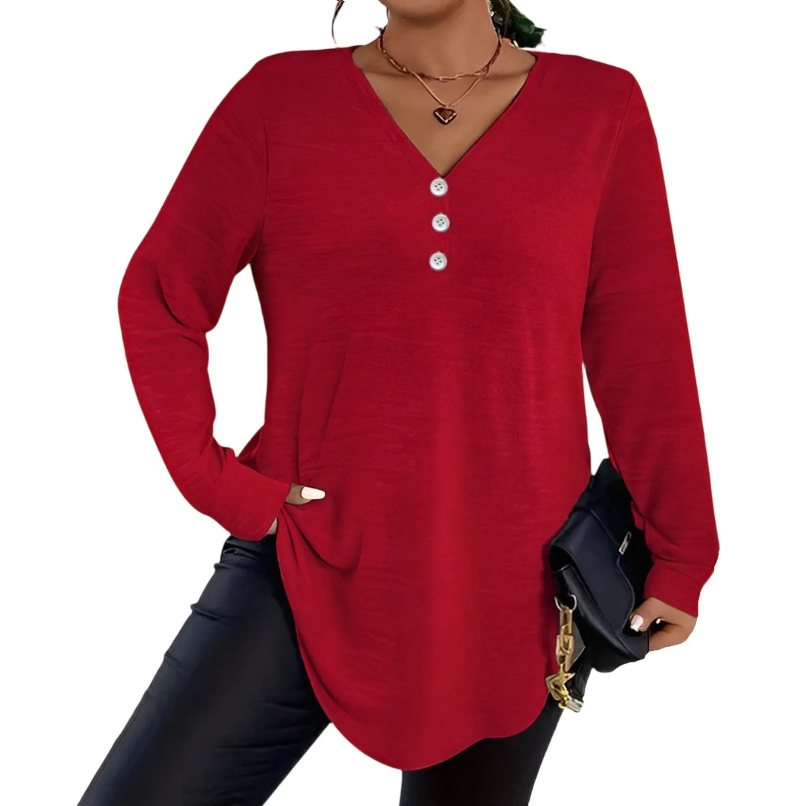 TEMU 가을/겨울 여성용 단색 버튼 장식 V넥 캐주얼 다용도 긴팔 티셔츠, 가을 패션