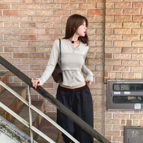 [다잇템]여자 입술넥 버튼 롱슬리브티 코르셋 코디 세트