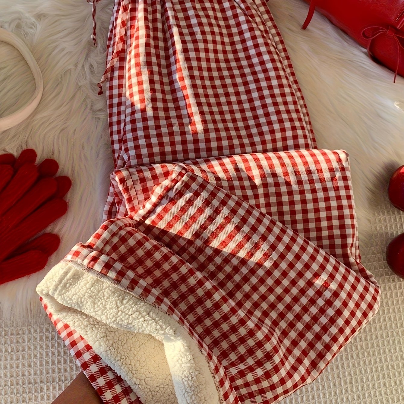TEMU 여성용 드로스트링 허리 포켓 격자무늬 와이드 레그 루즈핏 캐주얼 팬츠, 보온 및 보온성을 위한 양고기 털 사용