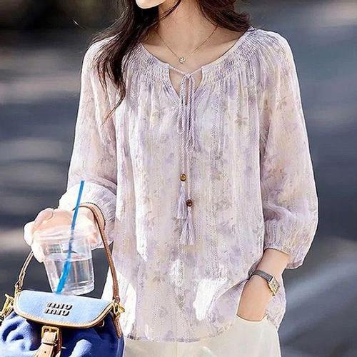 ONM 봄 화사한 자수 블라우스 라운드넥 프릴 스모크