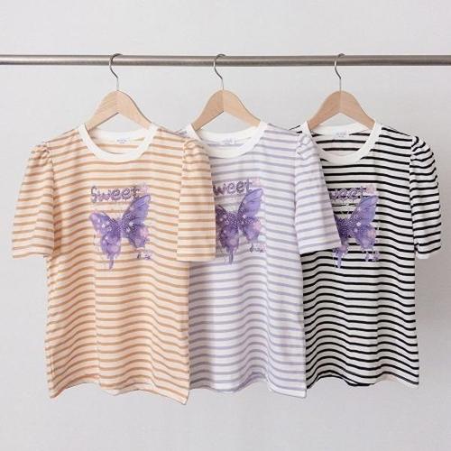 [옷자락]여성 키치 스타일 큐빅 나비 프린트 스트라이프 퍼프 티