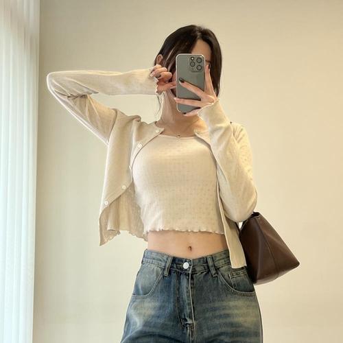 [옷자락]여자 스카시 펀칭 물결 크롭나시 라운드 가디건 세트