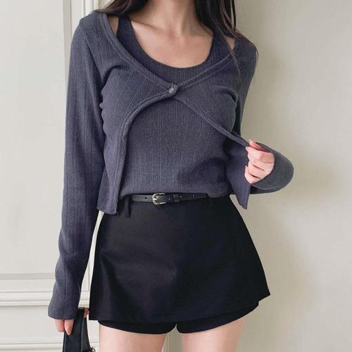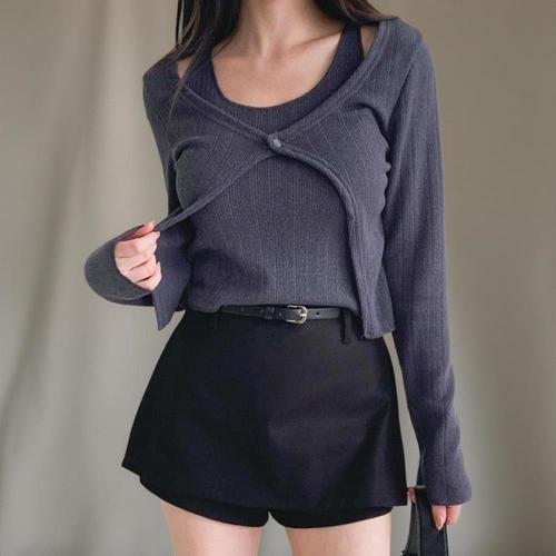 [옷자락]여성 슬림 홀터넥 크롭 나시 가디건 티셔츠