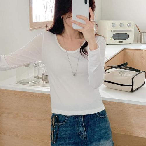[신상오픈런]긴팔쫄티 라운드넥 스판 크롭 슬렌더 여성44 티셔츠 (29414845)