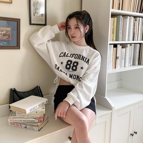 밑단 스트링 라운드 가을 맨투맨 긴팔 쇼트 여성 블랙 캐주얼 오버핏 소매 레터링 크롭