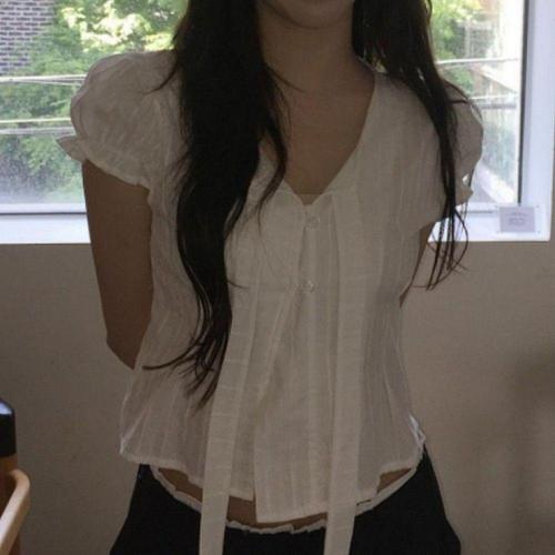 |CHH4242|여성용 여름 리본 장식 퍼프 소매 크롭 블라우스
