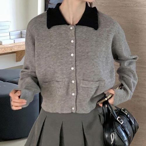 [XBI34KN5]크릴 배색 카라 시보리 니트 가디건 세미 크롭