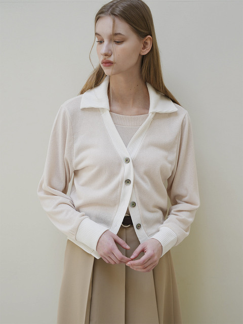[레이에] 여성 베키 배색 칼라 니트 나시 여자 가을 가디건 (에크루 크림 베이지)