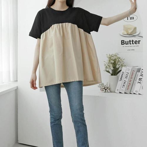 [다잇템]여자 반소매 SS 큰사이즈 투컬러 잔주름 티셔츠 (10127095A)