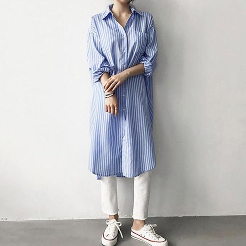 [옷자락]여자 클래식 스트라이프 여유핏 블루 롱 남방