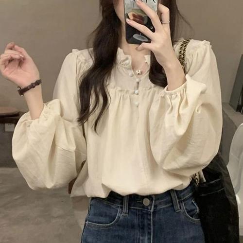 클래시브 패션 화이트 코튼 블라우스 2024, 우아한 스탠드 칼라 퍼프 슬리브 셔츠, 캐쥬얼 클래식 블라우스 탑, 여성 의류