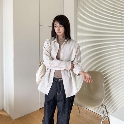 [옷자락]여성 클래식 노버튼 스트라이프 오버핏 셔츠
