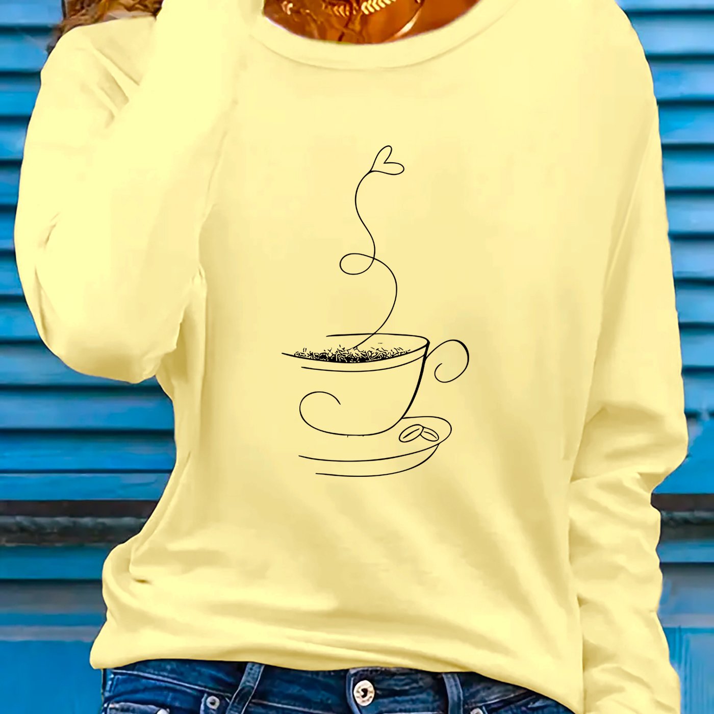 TEMU 여성용 캐주얼 롱 슬리브 티셔츠 - 스케치 커피 플로팅 패턴 프린트, 스트레치 폴리에스터 혼방, 라운드넥 봄/여름 상의, 세탁기 사용 가능 스포츠웨어 & 휴가복, 여성 티셔츠, 기하학적 디자인, 편안한 핏