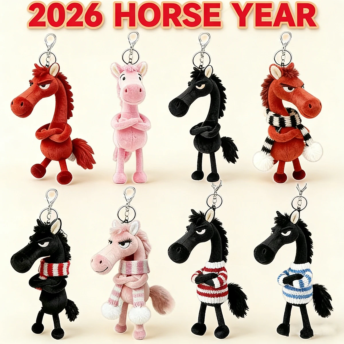 귀여운 플러시 말 열쇠고리 참, 2026년 말의 해 플러시 키링, 말 인형 백팩 장식 펜던트 새해 선물