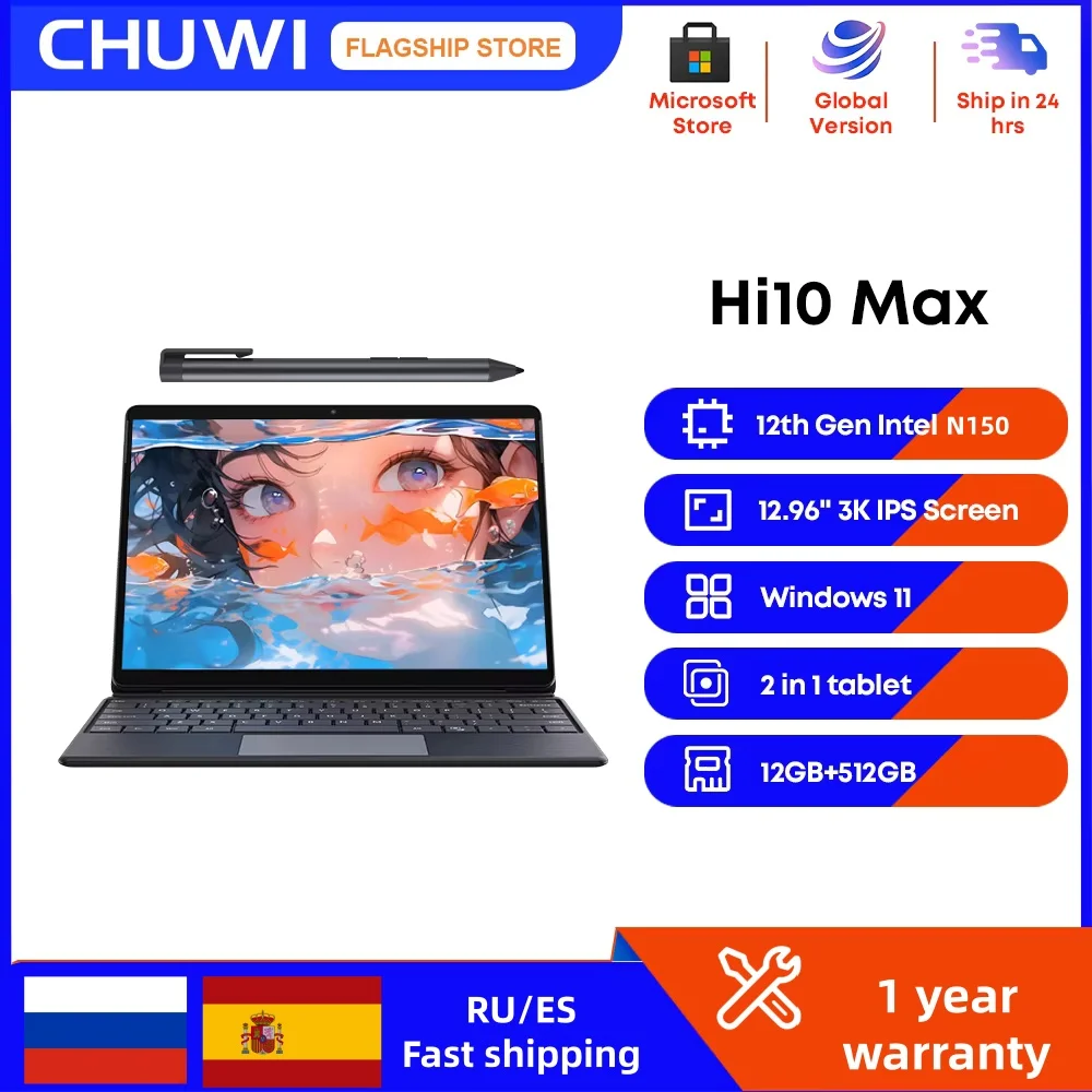 CHUWI Hi10 Max 태블릿 인텔 N150 12.96인치 3K 터치스크린 512GB SSD 12GB RAM 태블릿 키보드 스타일러스 지원 2 IN1 윈도우