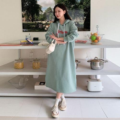 [유야]기모 면 무지 후드 플레어 롱 원피스 -OP0423H- 빅사이즈 루즈핏 여성 겨울