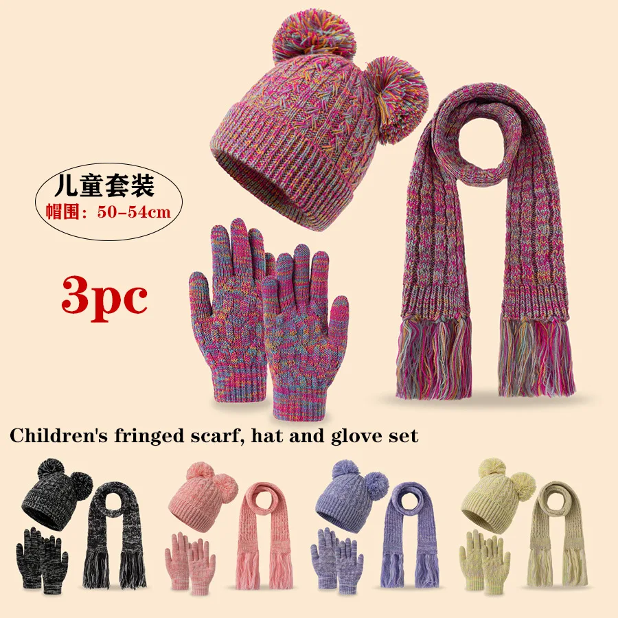 겨울용 귀여운 더블볼 플리스와 두꺼운 3-14세 어린이용 태슬 스카프, 모자 및 장갑 세트
