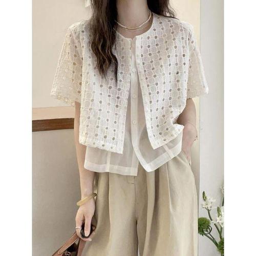 로젤라 여성 여름 라운드 자수 반팔 블라우스 여성 반팔티셔츠