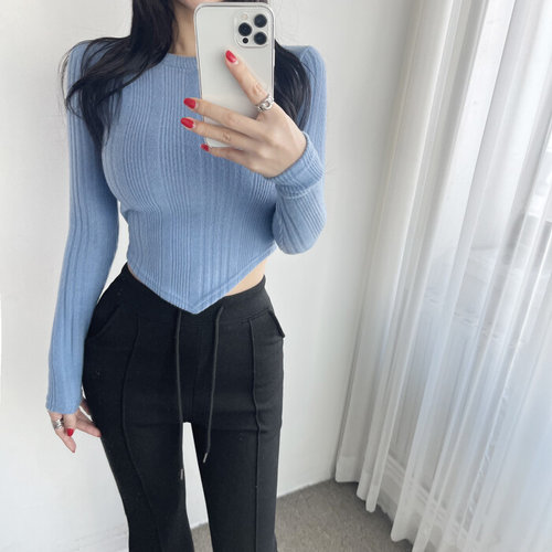 글램핏 / 라운드 슬림 타이트 핏 골지 니트 삼각 언발 티셔츠 3