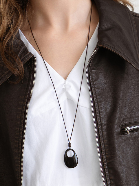 [타티아나] 블랙 페블 레더 스트링 롱 목걸이 NZ2539