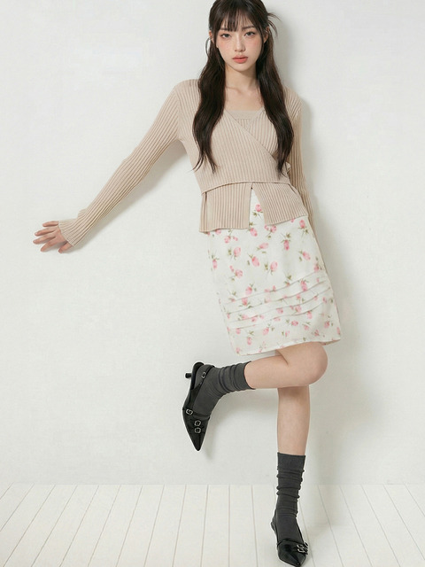 [탑걸] 리브드 플라워 슬릿 스커트_T611BT712