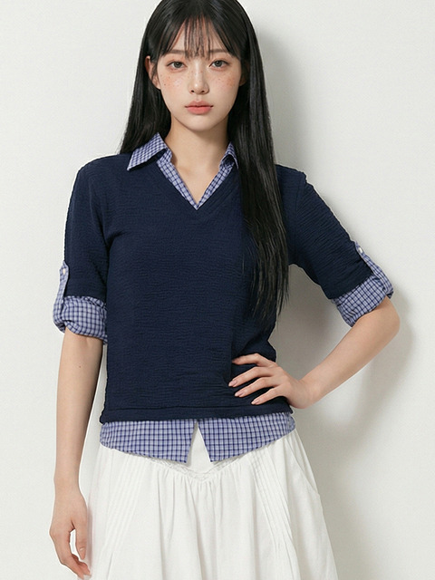 [탑걸] 체크 레이어드 롤업 슬리브 블라우스_T611TP128