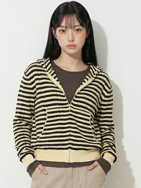 [탑걸] 투톤 스트라이프 후디 니트 집업_T611OT805
