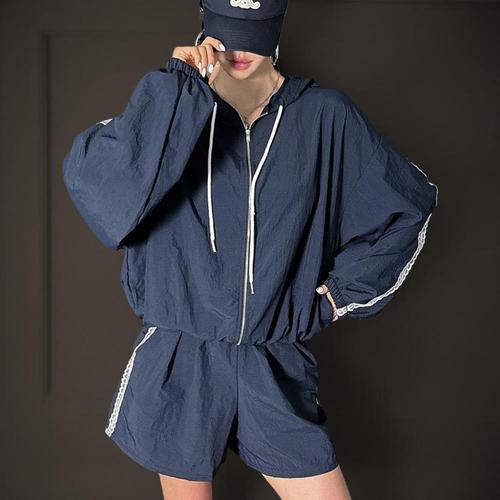 |KSD25F4|여성 스포츠 스타일 레이스 후드 집업과 밴딩 반바지 세트