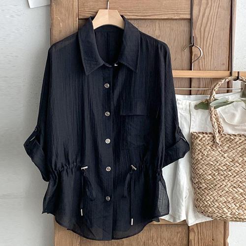 여성 카라넥 허리스트링 텐셀 여름 롤업 블라우스 DGB-WBL-4572-블랙