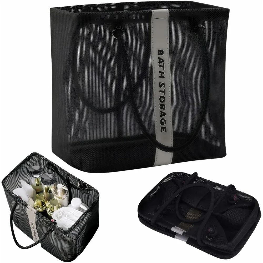 메쉬 샤워 캐디 토트백 휴대용 속건 욕실 정리함 대학 기숙사 체육관 여행 수영 캠핑용 손잡이 포함 블랙 세트