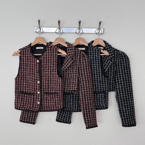 [옷자락]여성 투피스 진주단추 배색 조끼와 크롭 트위드 자켓 세트