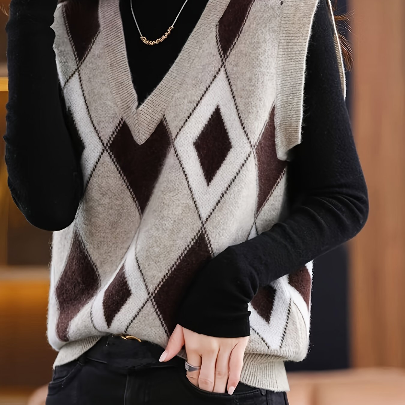 TEMU 새로운 가을/겨울 빈티지 V넥 컬러 블록 패턴 조끼 니트