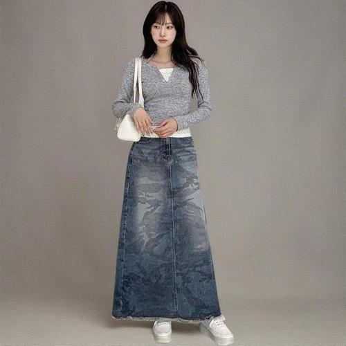 [옷자락]여성 카모 워싱 데님 롱스커트 트임 무드 스커트