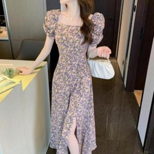 [신상오픈런]여성 퍼프 소매 스퀘어넥 롱 원피스 앞트임 플레어 드레스 (46200140)