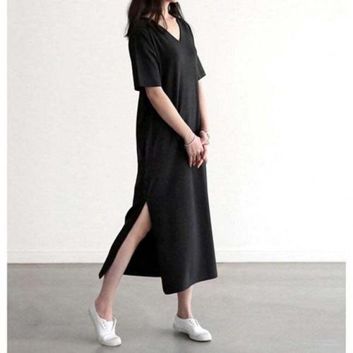 [신상오픈런]여성 루즈핏 반팔 롱원피스 옆트임 체형 보정 라운드넥 (46200125)