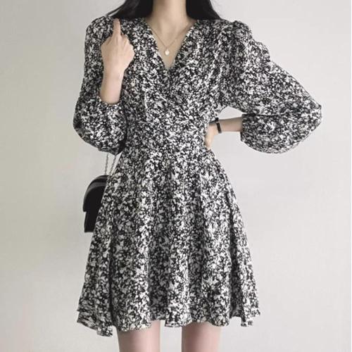 [옷자락]여자 러블리 꽃패턴 랩 트임 플레어 미니 원피스